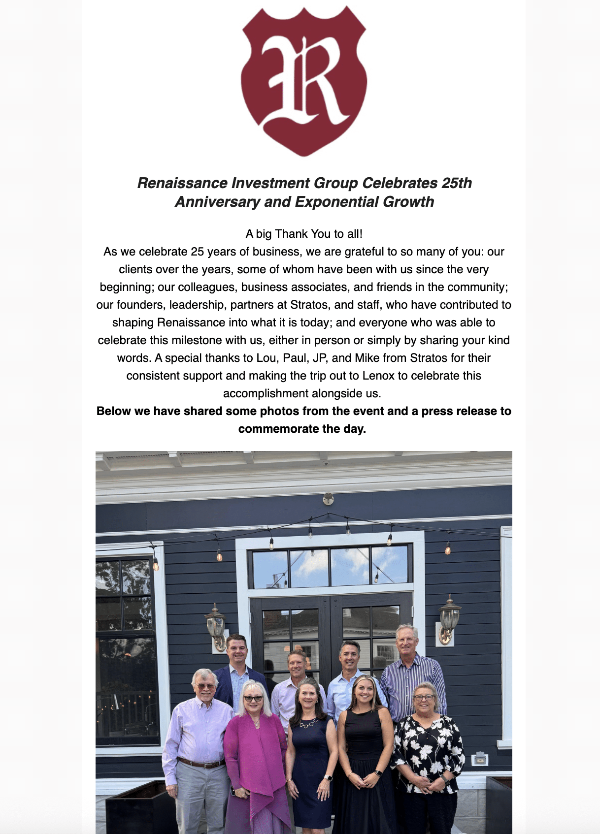 At Renaissance Investment Group, our team conducts in-depth research and analysis on-site and benefits from participation in high-level investment committee involvement with other industry leaders. To share in our economic insights and receive other information regarding upcoming events, market commentary, and updates on our firm, please subscribe below: